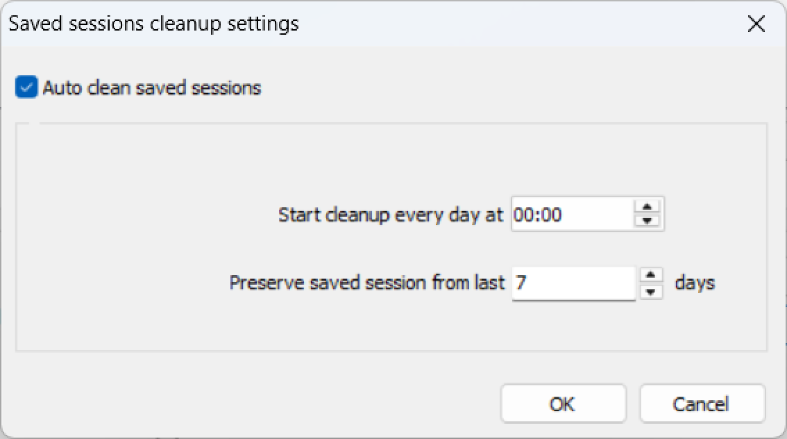 <table><thead><tr><th width="203.3333740234375">Option</th><th>Description</th></tr></thead><tbody><tr><td>Auto clean saved sessions</td><td>Select this option to activate the automatic cleanup of the saved sessions recordings database.</td></tr><tr><td>Start clean-up every day at</td><td>Set a start time for the clean-up process.</td></tr><tr><td>Preserve saved sessions from last ...days</td><td>Set the number of days for which saved session recordings will be preserved.</td></tr></tbody></table>