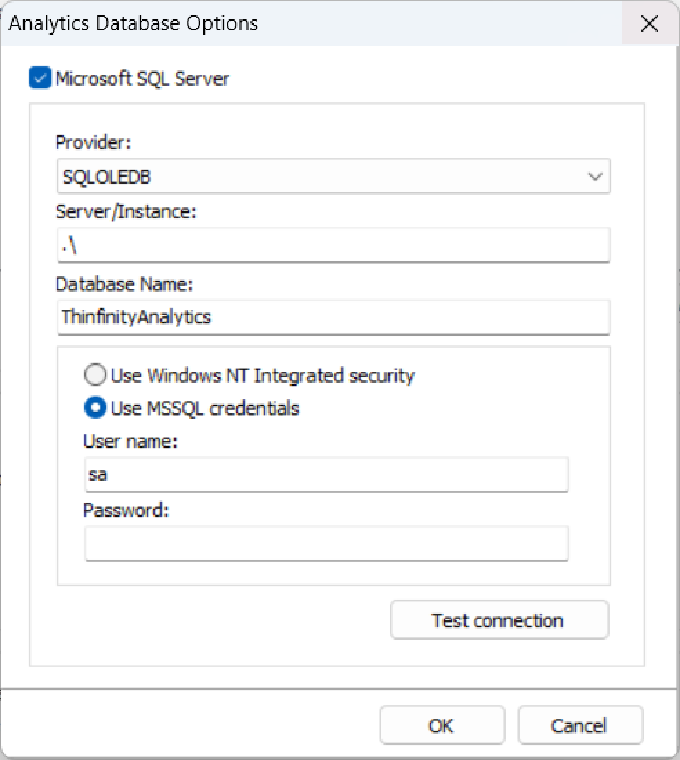 <table><thead><tr><th width="205">Option</th><th>Description</th></tr></thead><tbody><tr><td>Microsoft SQL Server</td><td>Select this option to activate the database connection parameters.</td></tr><tr><td>Provider</td><td>Use the default option. Alternatively, click the arrow button and select the desired option.</td></tr><tr><td>Server/Instance</td><td>Enter the name of the server and the database instance.</td></tr><tr><td>Database name</td><td>Use the default database name.</td></tr><tr><td>Use Windows NT integrated security/Use MSSQL credentials</td><td>Select one of the available security options.</td></tr><tr><td>Test connection</td><td>Use this button to test the connection to the newly created database.</td></tr></tbody></table>